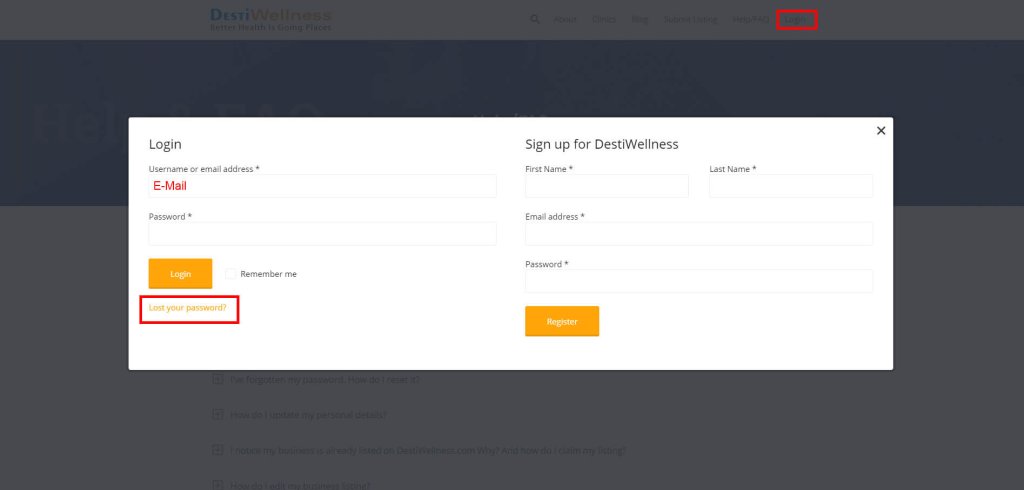 Next, enter the email address that was used to set up the account. Then press “Lost your password?” A link to reset your password will be emailed to the email address you entered above. If you don’t see it in 10 – 15 minutes, please check you junk or spam folder. If you require further assistance, please email us at admin@destiwellness.com