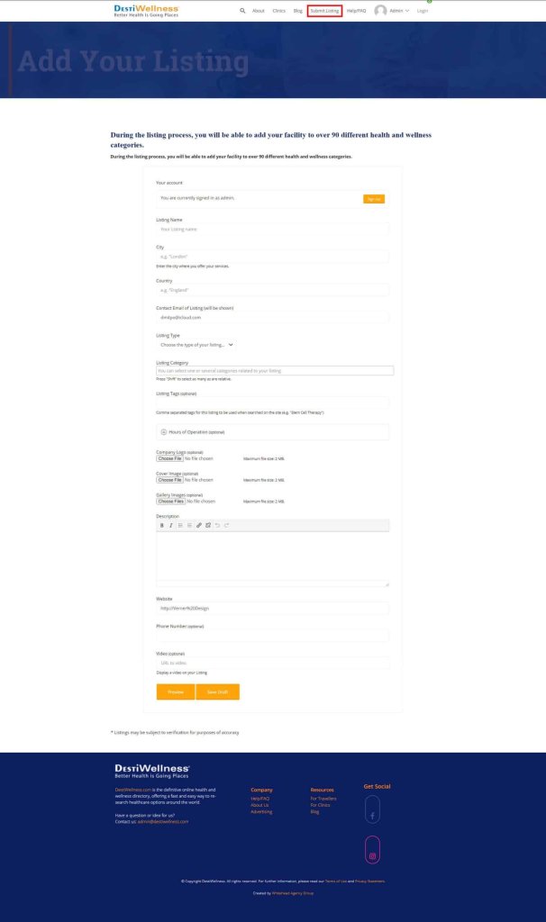 First, you need to sign up for an account. The account contains some basic personal information about the person adding the listing such as their name, personal email, etc. To get started, simply click on the “Submit Listing” button.